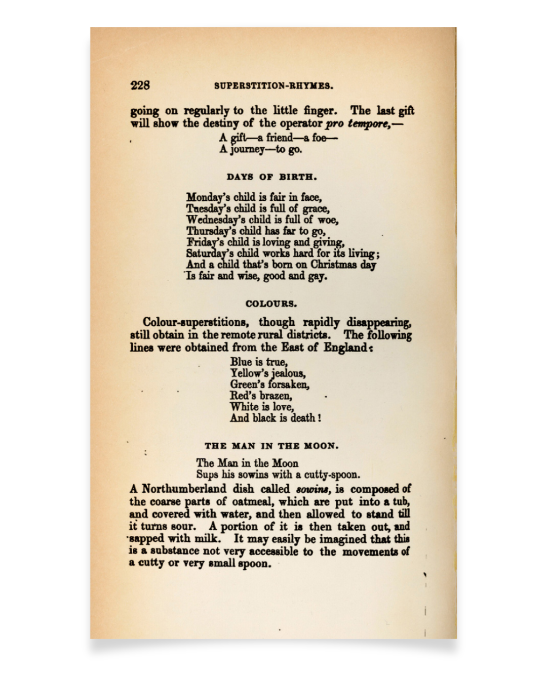 Halliwell-Phillipps, J.O.(1849). “DAYS OF BIRTH.” In Popular Rhymes and Nursery Tales: A Sequel to the Nursery Rhymes of England. J.R. Smith, London, U.K. p. 228.