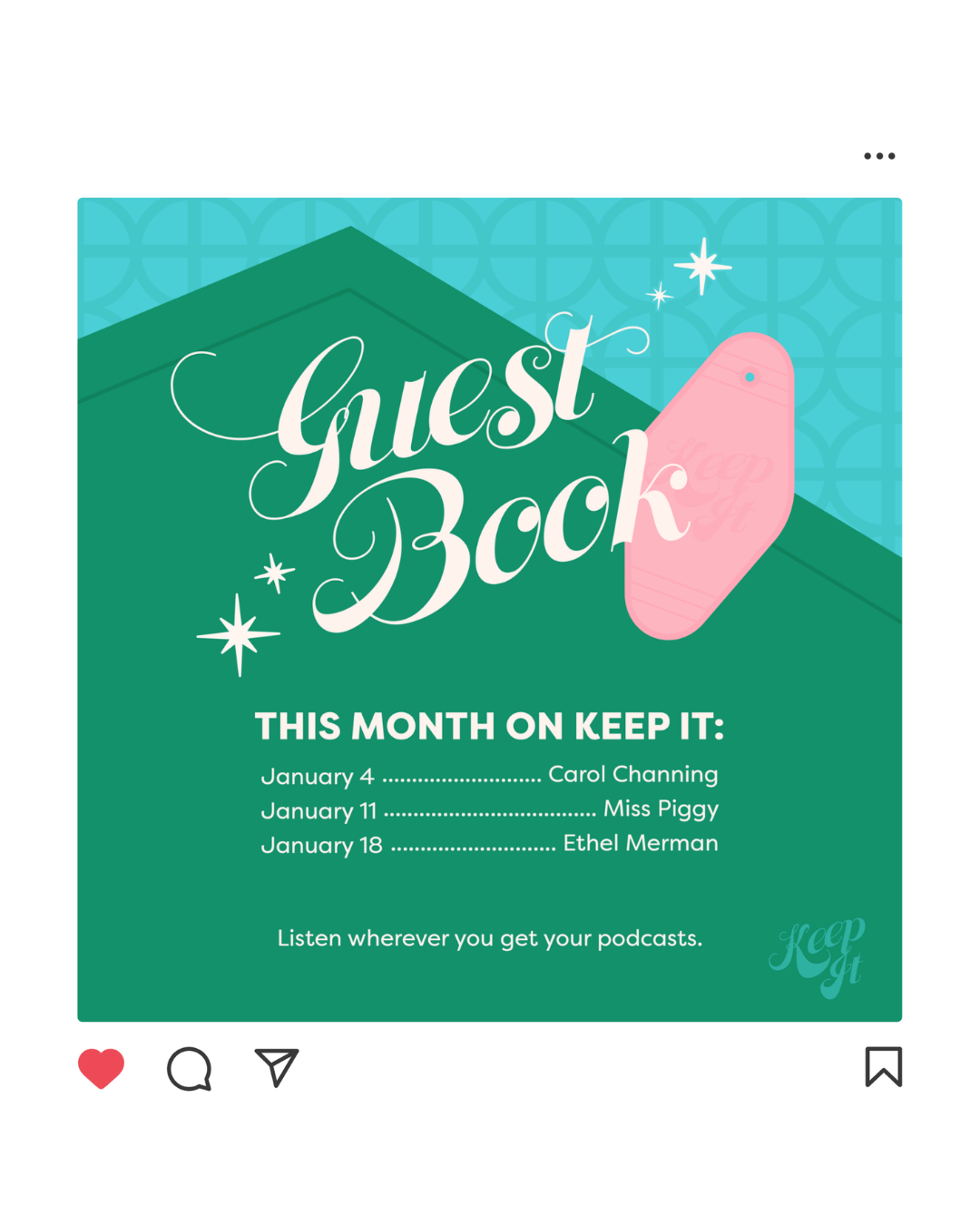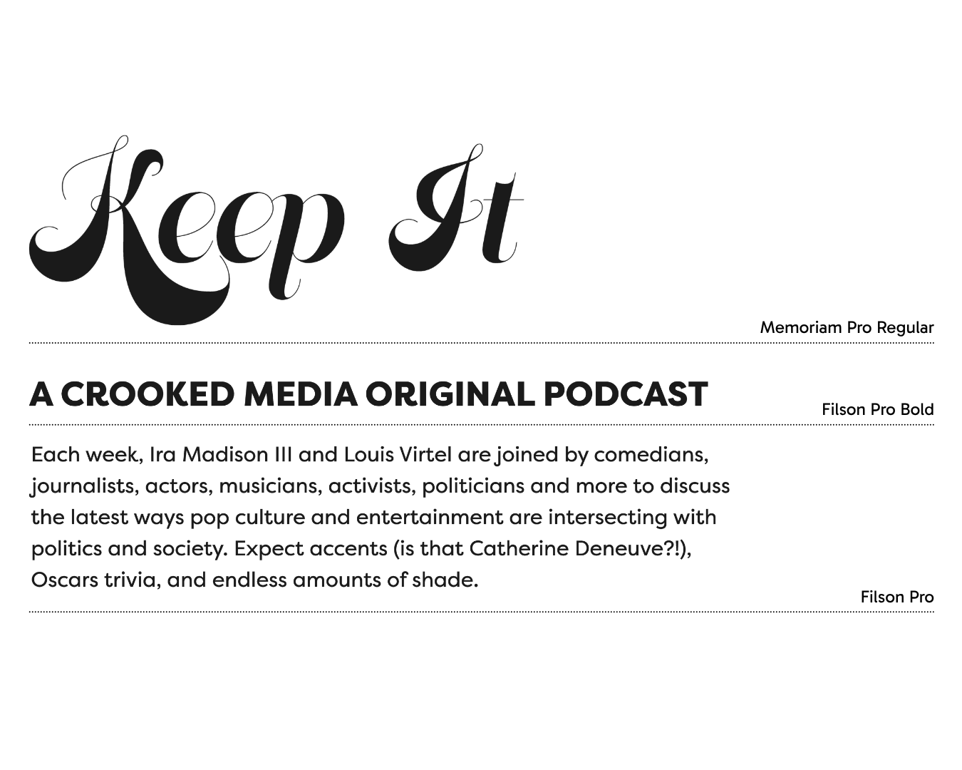 In summer 2022, I was tasked with re-designing the podcast art and branding for Crooked Media’s award-winning pop culture podcast, “Keep It.” Each week, hosts Ira Madison III and Louis Virtel, are joined by comedians, journalists, actors, musicians, activists, politicians and more to discuss the latest ways pop culture and entertainment intersect with politics and society. As two cinema-lovers, Ira and Louis wanted their key art to reflect their love of classic movies and celebrity culture. So, put on your headphones and check in to the Keep It Resort. Inspired by Slim Aarons’ iconic photographs of Hollywood elites in Palm Springs and Beverly Hills, we recreated a midcentury poolside scene on a Old Hollywood, sound stage-style backdrop for the “Keep It” key art and universe.