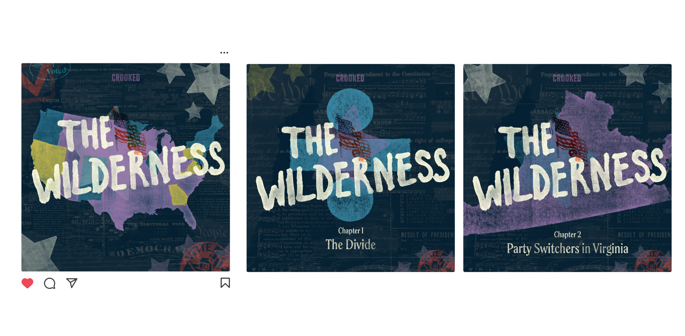 “The Wilderness” had an existing brand identity that I was tasked to expand upon. Each season of the show featured the same outline of the mainland United States with a hand-drawn logotype in the center, but with a twist. For season 3, I created a collage of American historical documents and adorned it with stamp graphic treatments. The team requested I avoid overt references to red, white, and blue, so I leaned into the colors of the undecided voters for the overall palette.